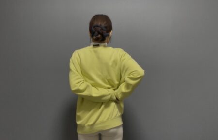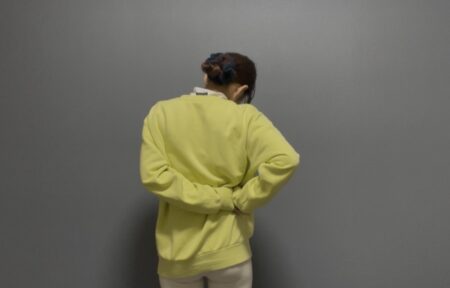 そのまま、手を後ろで組んで“ワキ腹に添える”ように固定します。