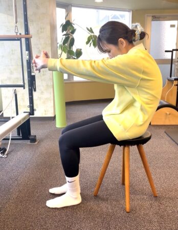 腕を前に出す力と反発するように、背中を後ろへ丸めていきます。イメージは「背中を後ろから誰かに引っ張られている」ような感覚です。