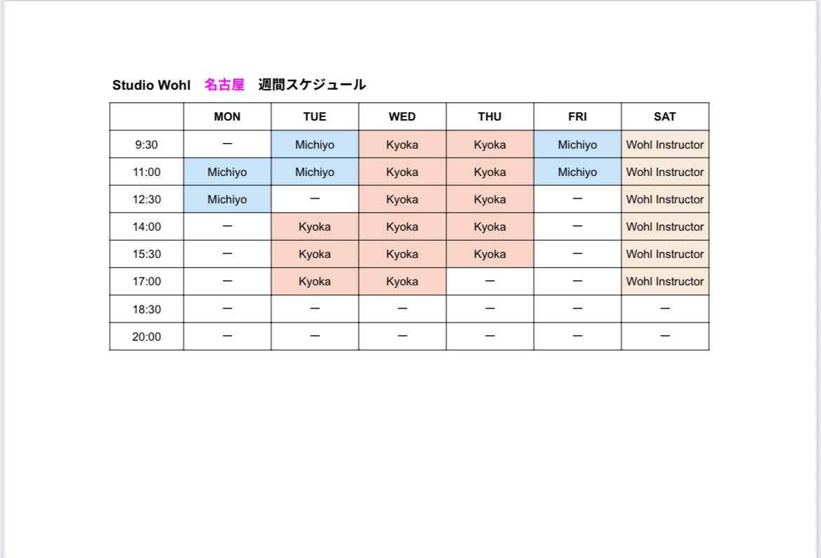 Studio Wohl(ヴォール)名古屋スタジオのスケジュールです。